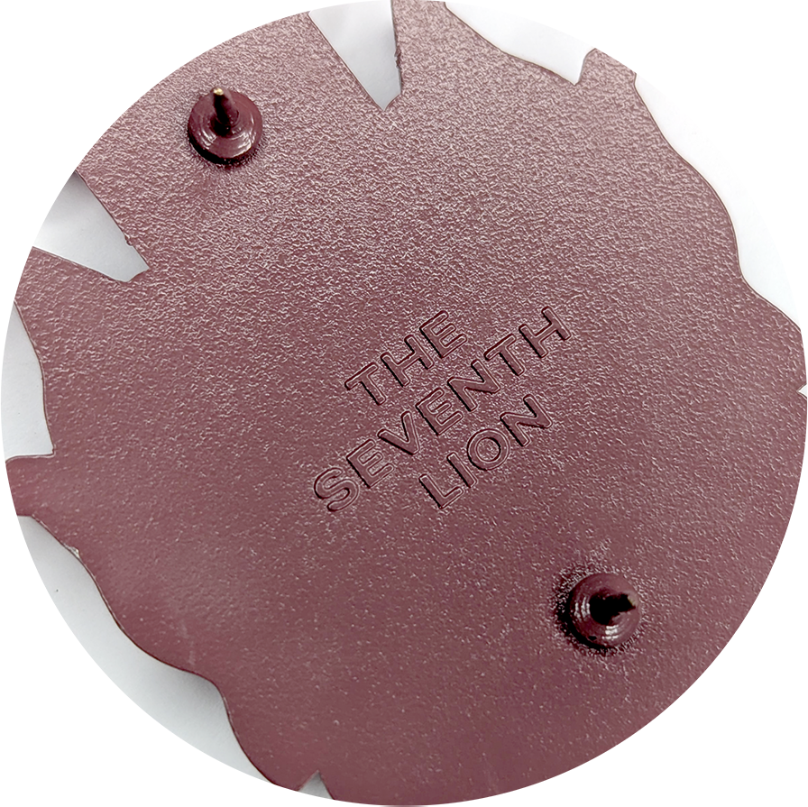 Two points of contact for secure attachment to bags, lapels and shirts, with embossed The Seventh Lion logo on back.