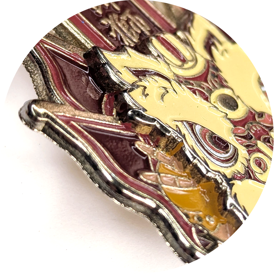 The two-tiered design adds depth and dimension to the accessory that you won't find on any other pin! The glossy enamel and gold-plated edges will certainly be a stand out on jackets, bags, or hats.