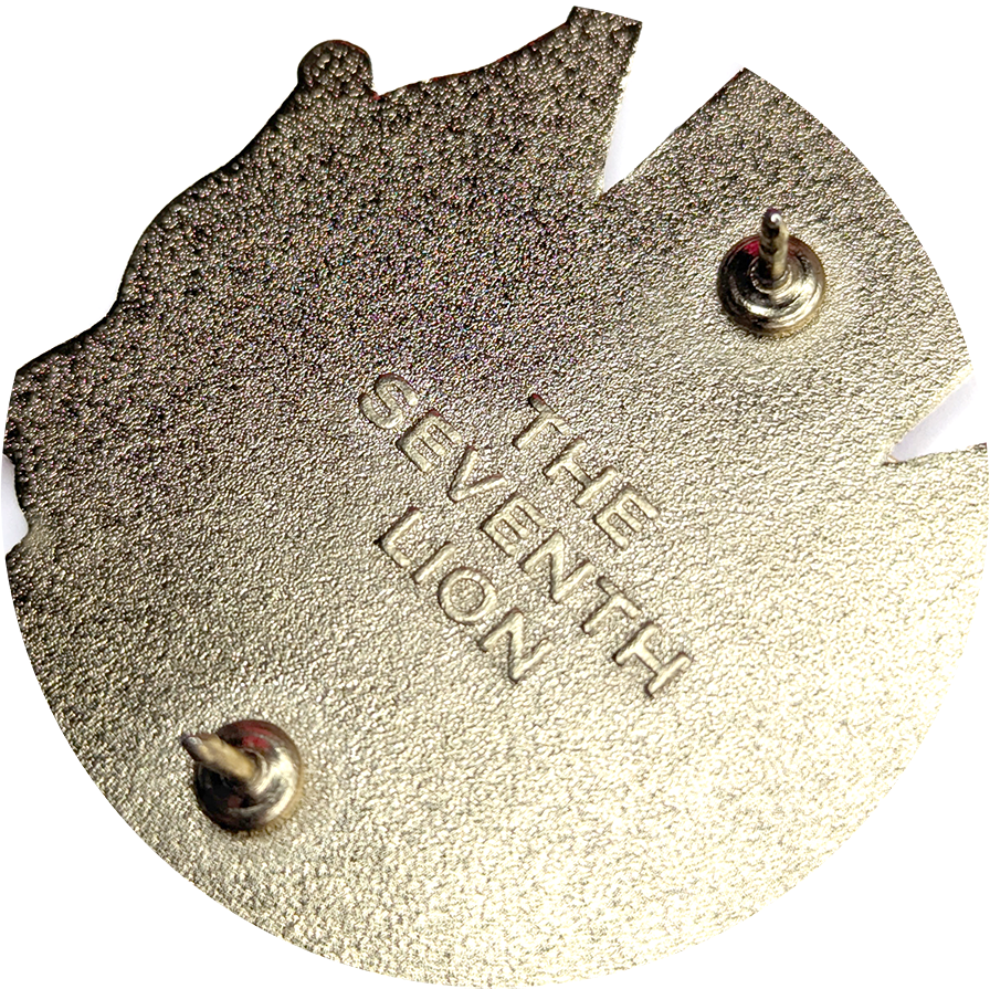 Two points of contact for secure attachment to bags, lapels and shirts, with embossed The Seventh Lion logo on back.