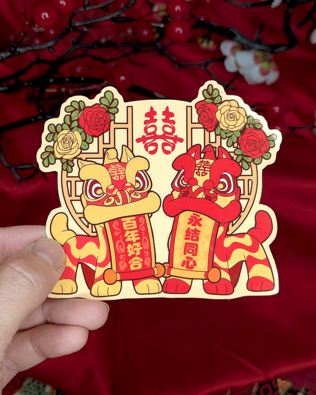 Celebrate love, tradition, and joy with our Lion Dance Wedding Vinyl Sticker. Inspired by the traditional Chinese lion dance, a symbol of good luck and prosperity for the newly wedded couple. This adorable 10cm vinyl sticker captures the festivities of the big day, making it a great gift for newly weds, or as guest favours at your own wedding! A lovely, handcrafted gift is a lovely way to remember the occasion by.